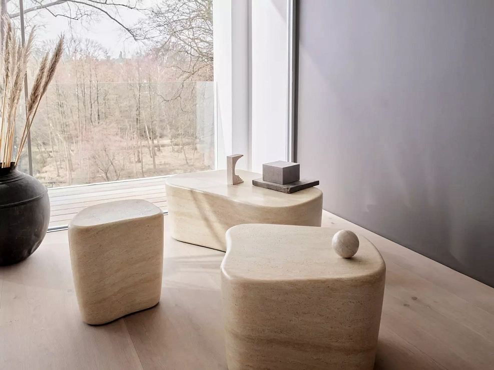 Мебель изготовлена из бетона и покрыта имитацией травертина, в которой узоры и текстуры натурального травертина воспроизведены с неимоверной точностью.